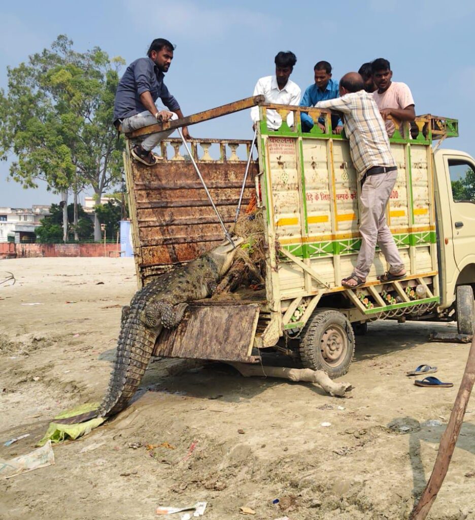 वन विभाग की टीम ने मगरमच्छ को पकड़कर गंगा में छोड़ा